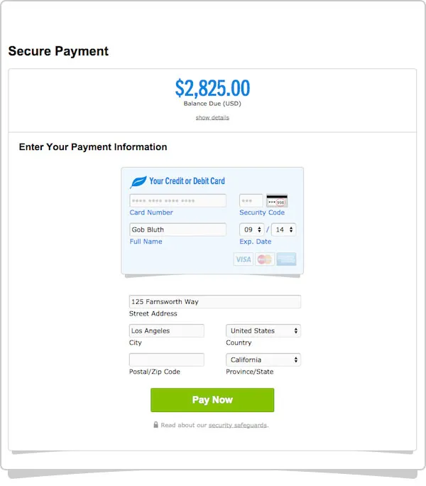Clicking on “Pay Now” will lead your client to a secure, simple payment page, where they can enter their credit card information and pay your invoice in a jiffy – woot!